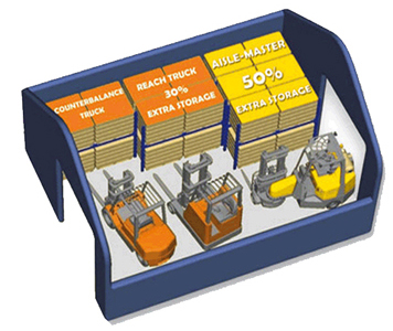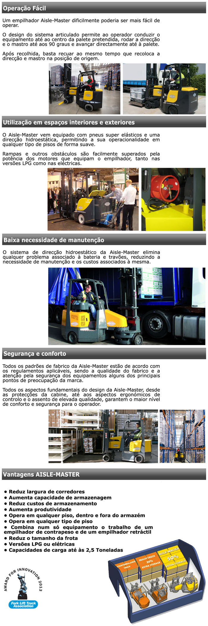 Os empilhadores articulados Aisle-Master são equipamentos versáteis capazes de operar em espaços muito estreitos, permitindo uma considerável redução das dimensões dos corredores e um correspondente aumento da capacidade de armazenamento de espaço até 50%.