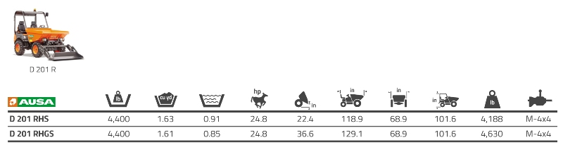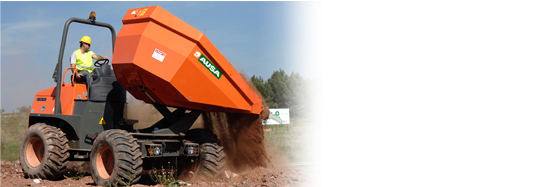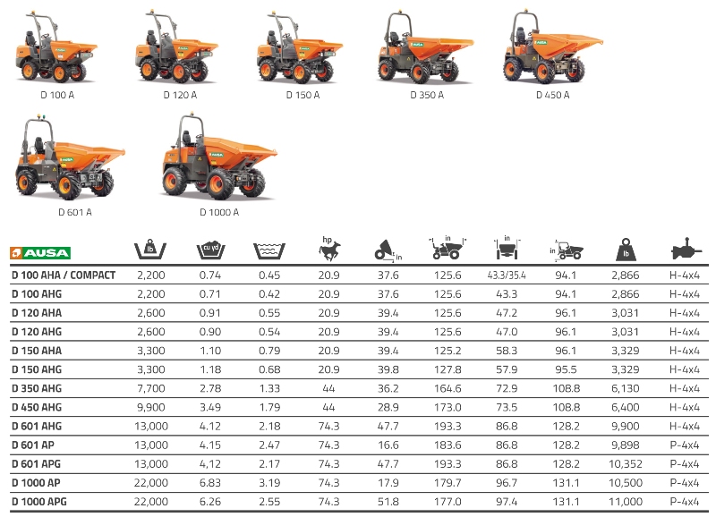 Dumpers todo-terreno de chassis rígido ou articulado com tracção 4x4, transmissão hidrostática e capacidades de 850 kg a 10000 kg.