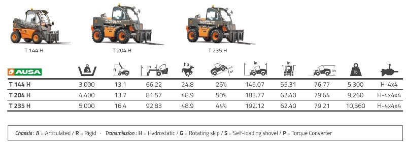 Empilhadores todo-terreno Telescópicos com tracção 4x4, transmissão hidrostática e capacidades de 1300 kg a 3000 kg.