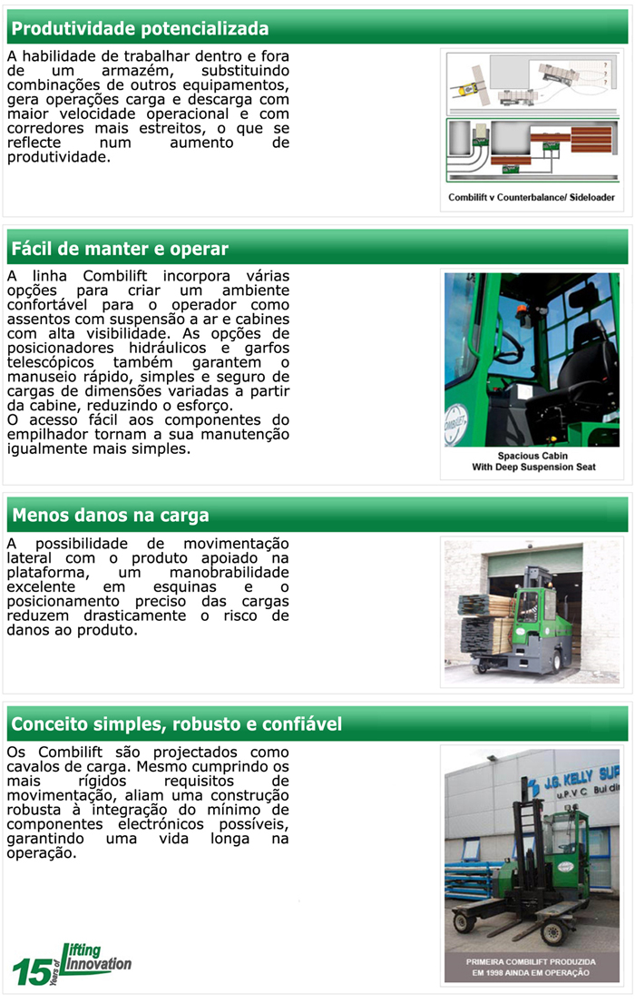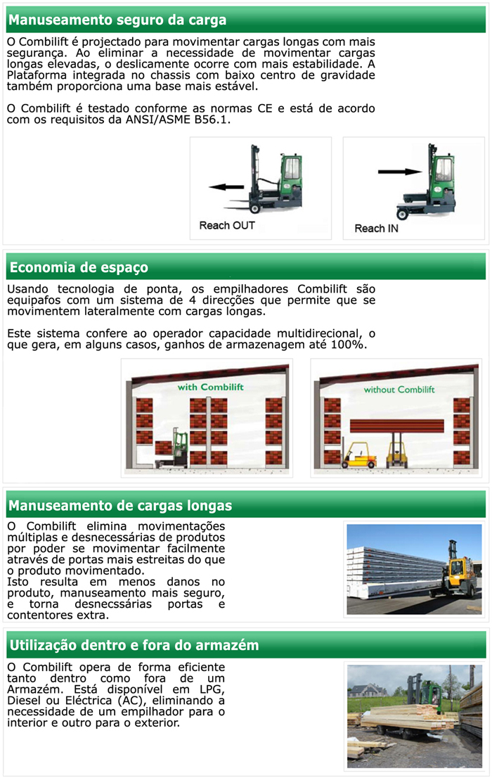 O Combilift representa o combinar de um empilhador tradicional com um sideloader, sendo o primeiro equipamento multidirecional de motor de combustão interna e com tracção integral. Altamente manobrável, seguro, eficiente e com a melhor relação custo benefício, é o parceiro certo para operações com cargas de grandes dimensões em espaços o mais reduzidos possíveis.