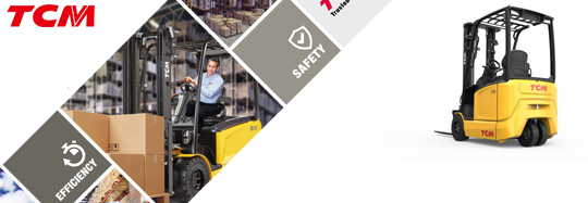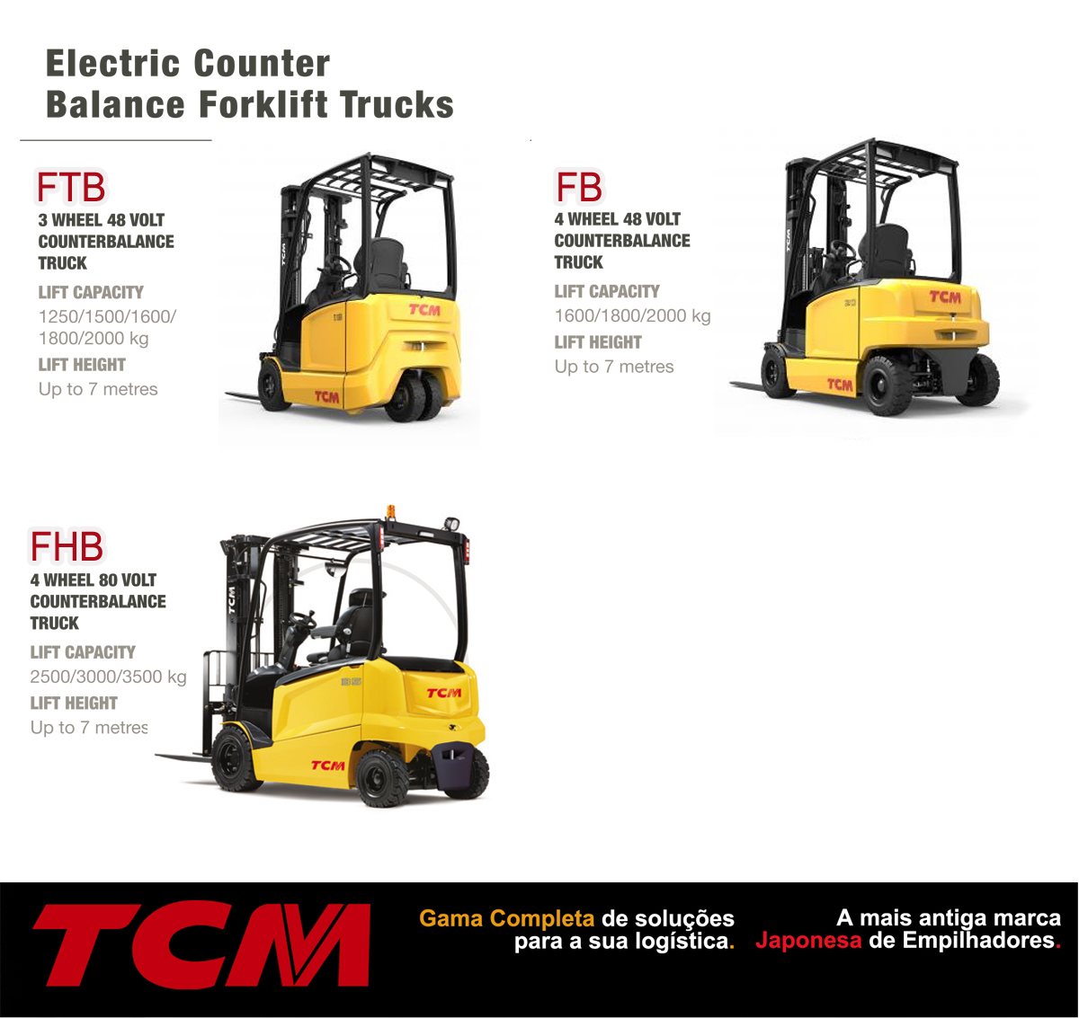 Gama de empilhadores eléctricos TCM, com capacidades entre os 1250 e os 2000 kg no caso dos equipamentos 3 rodas e 1600 a 3000 kg para equipamentos 4 rodas.